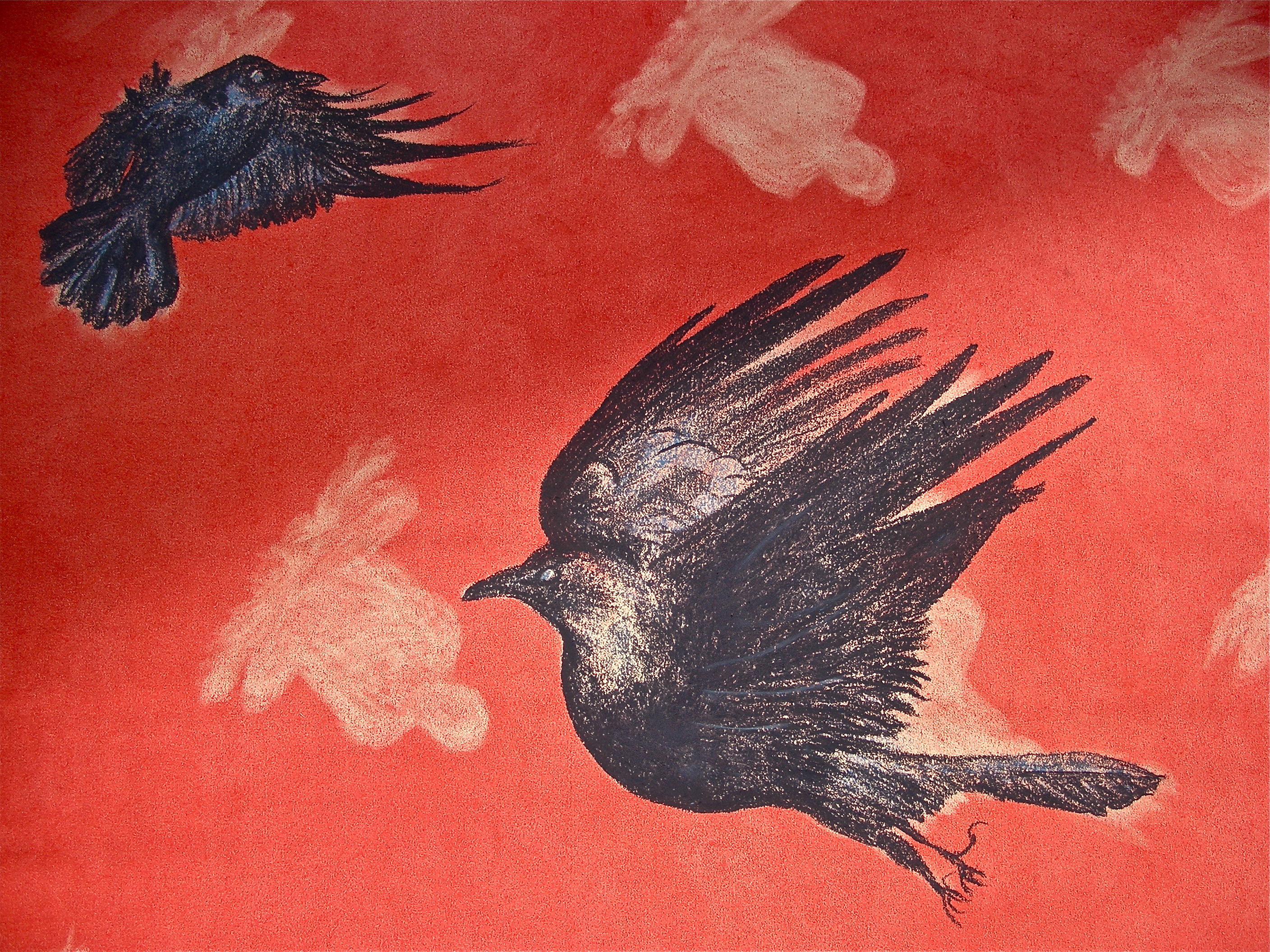 Elizabeth photographed the living crows that became the subject of this drawing. She started the drawing with the pastel background then used charcoal to draw the crows after which, she erased the Buddhas.
