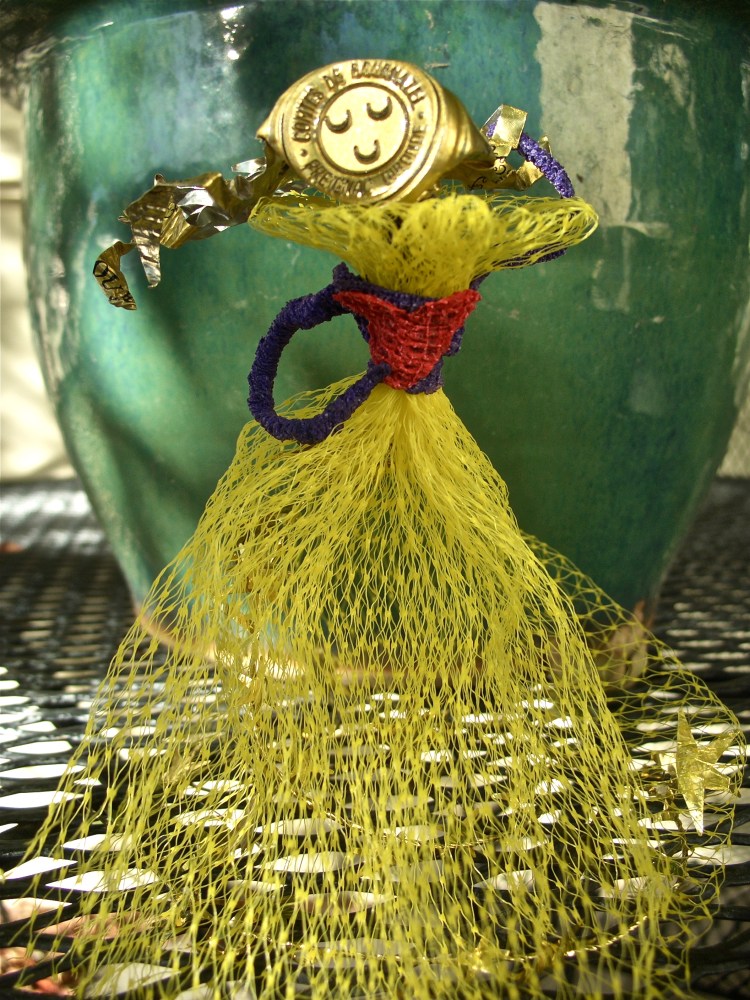 Elizabeth used the wrap from a bag of lemons and a medical lab’s purple and red tapes for the body. A wine bottle’s metal cork protector provides the face and hair.