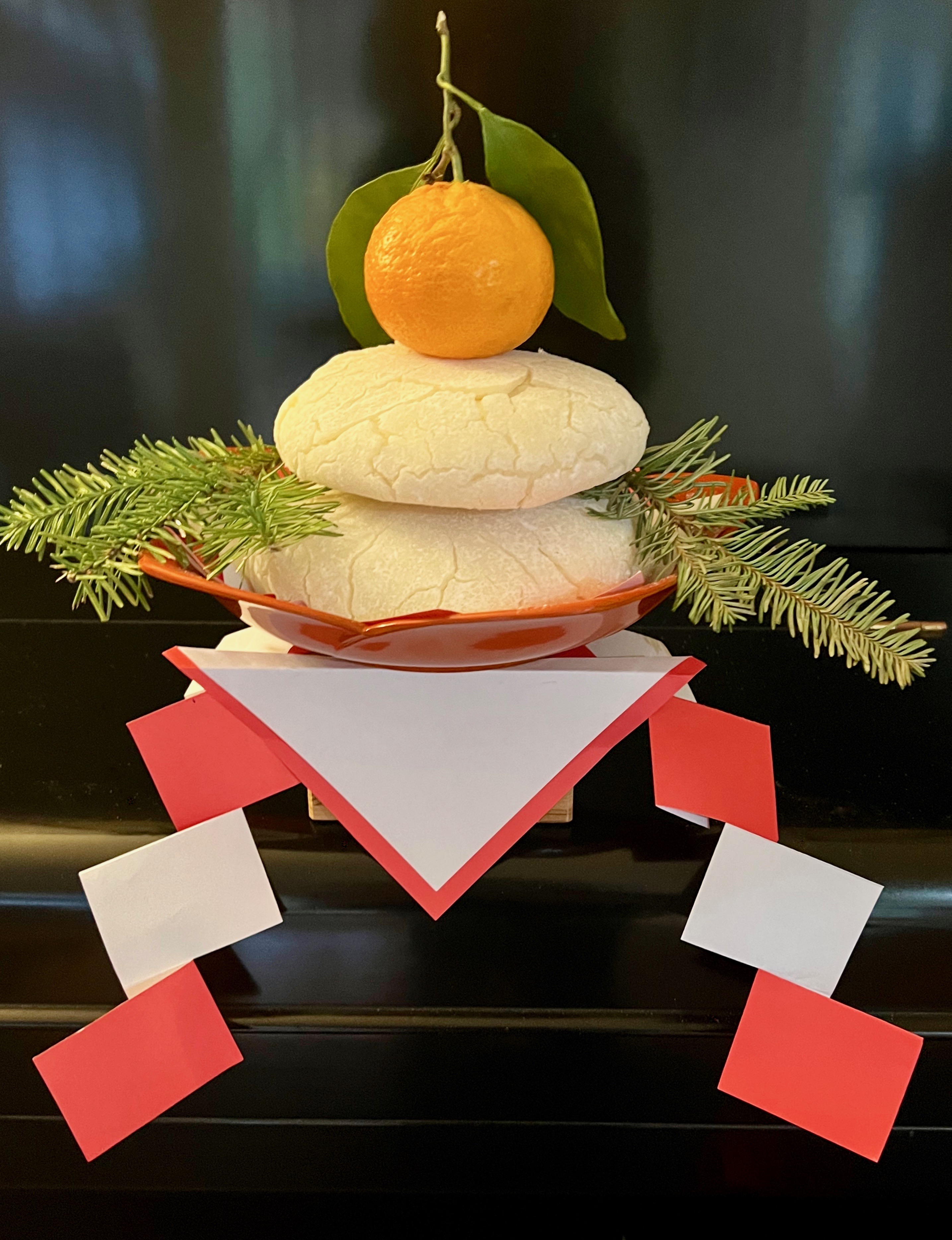Kagami (mirror) mochi (rice cake) is made and placed on an altar right after Christmas when the festive Japanese season begins. The mandarin orange symbolizes a family’s generational continuity; the mochi disks, the passage of years. During the season’s Kagami Biraki (opening the mirror), the now brittle mochi is broken and shared to both celebrate the new year and prevent illness and accidents. Kagami mochi is one of many meaningful traditions in Japan.