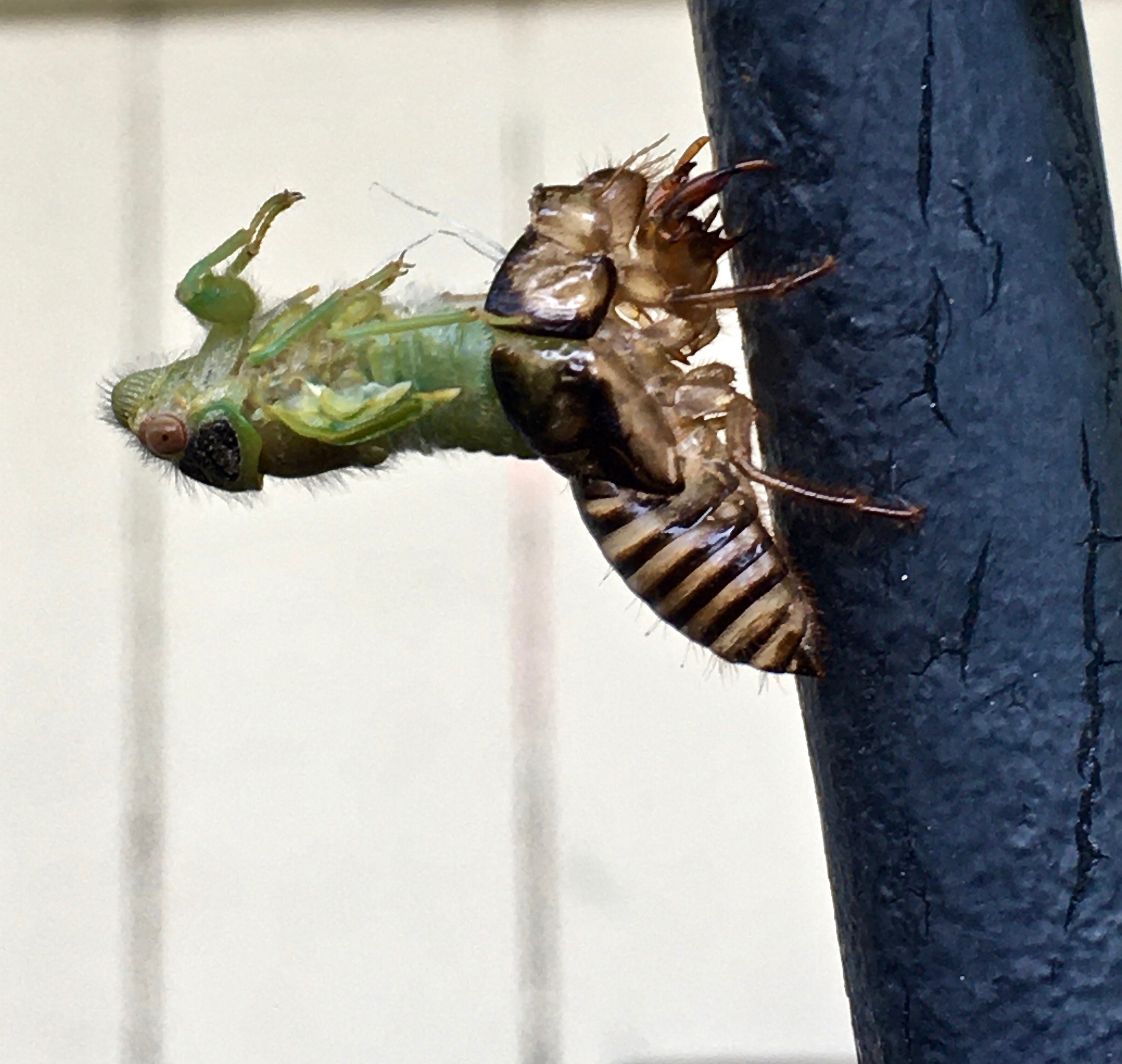 I was startled to see this cicada emerge from its “skin” on our outdoor chair at the beginning of the proliferation of cicadas that spread through the United States in 2021.