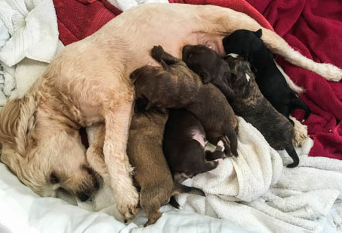 Five days after her arrival, she gave birth to six large, healthy, hungry puppies.
